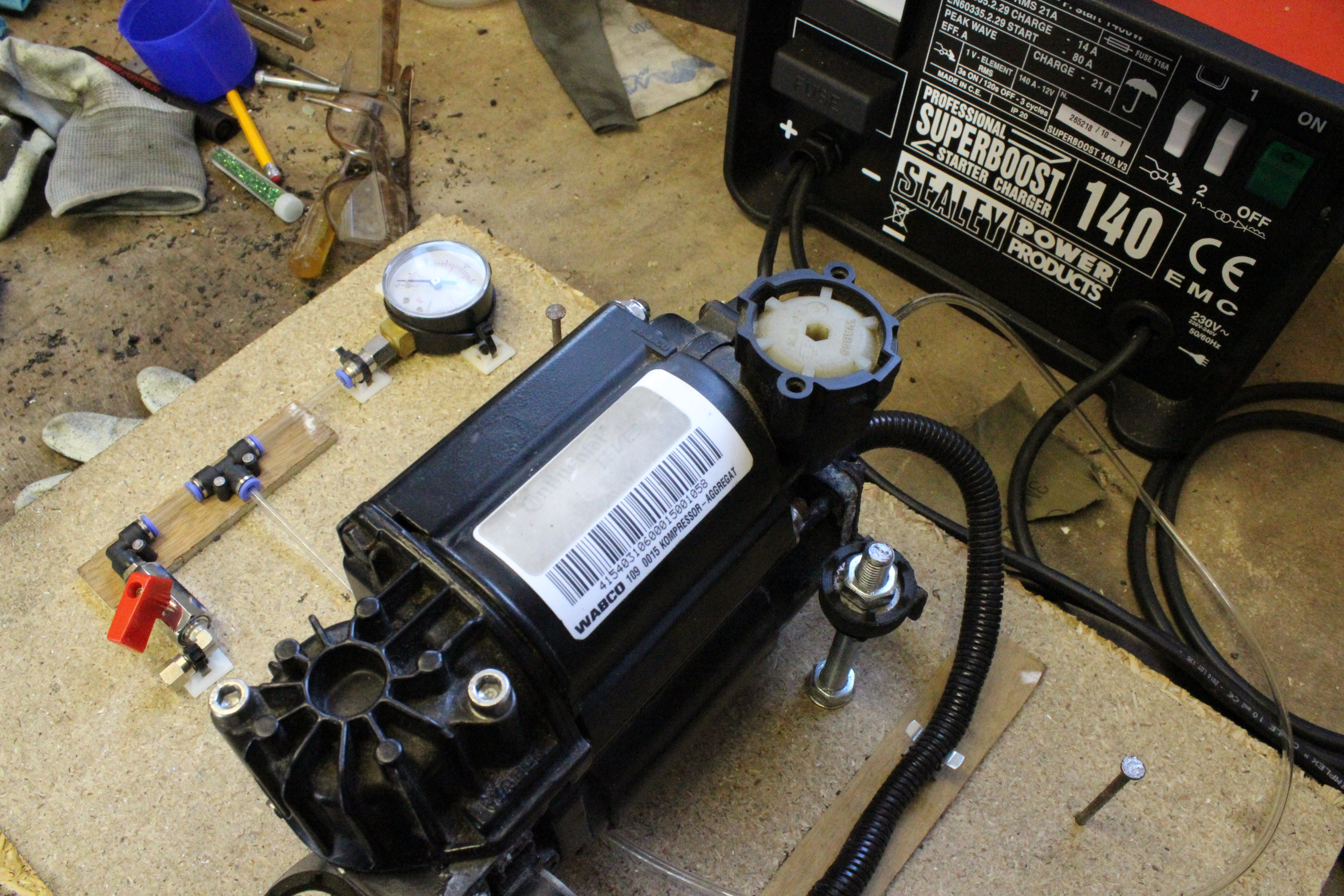 Testing the new rings involves a test-rig comprising an old Audi Allroad compressor, a pressure guage and a battery charger to power it, all fixed on chipboard base - works a treat!